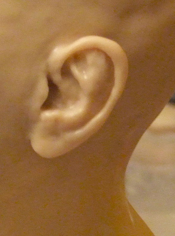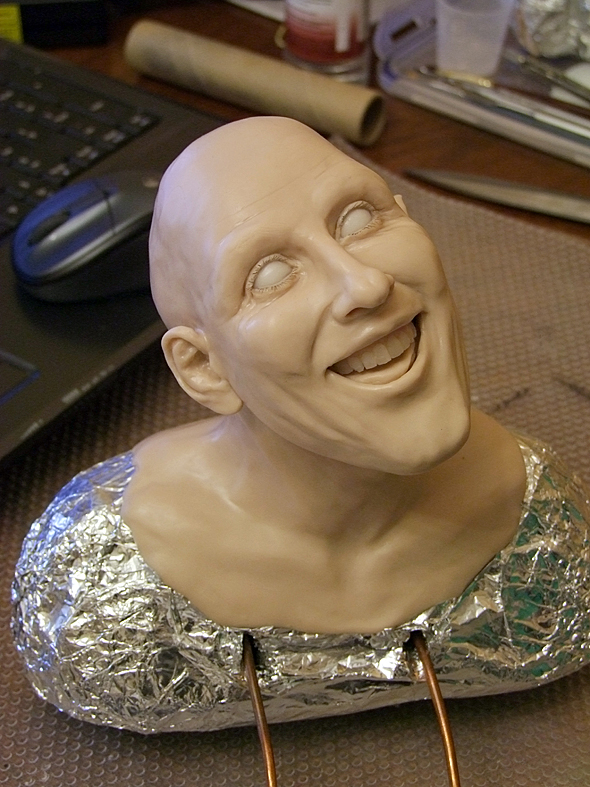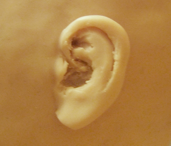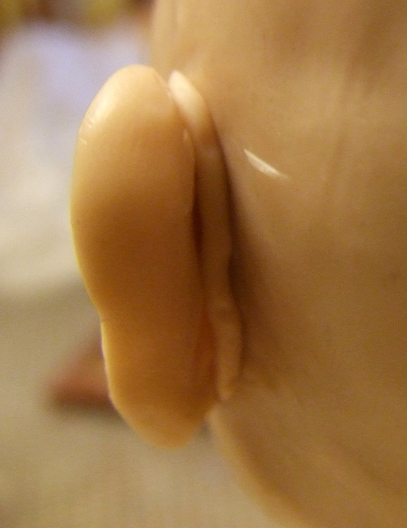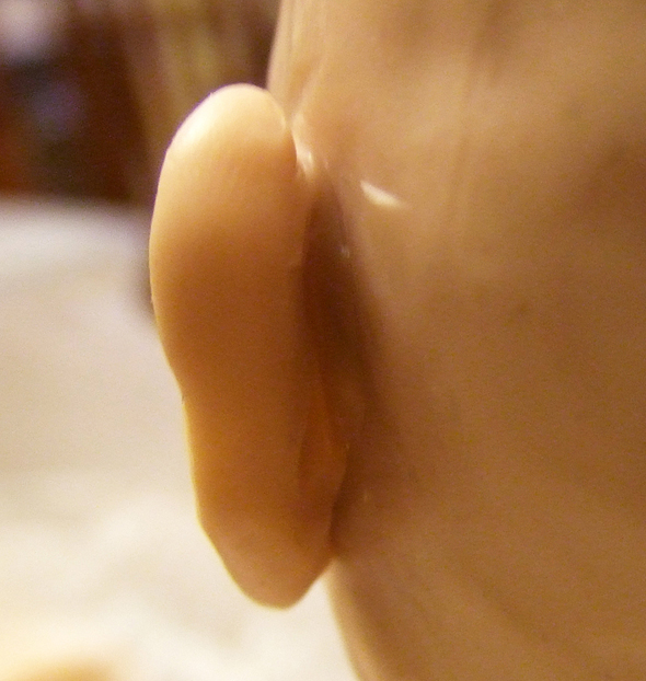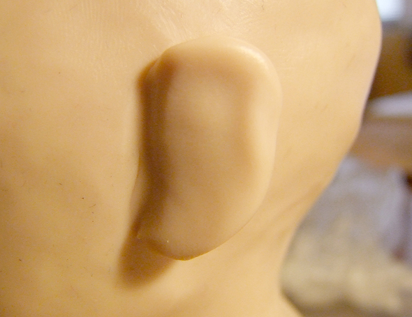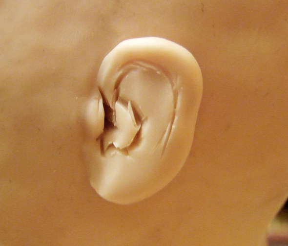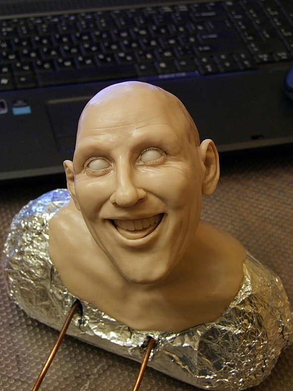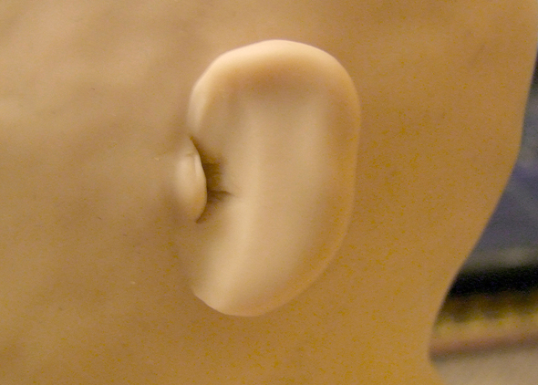 Шея и ушиНа проволочном каркасе формирую бюстик из фольги. Он, так же как и череп, должен быть очень плотным (этой наработкой со мной поделилась Е.Кунина). ![]() Фольги на него уходит достаточно много, но он многоразовый. И если ваша следующая кукла будет того же размера, его можно смело использовать. ![]() Из пластика формирую лепешку и одеваю на бюстик. Затем насаживаю голову так, чтобы проволока вошла в фольгу примерно на 1/3 черепа, формирую шею и леплю уши. ![]() Чтобы все это чудо не упало, делаю дополнительную опору из проволоки, которую вставляю прямо в фольгу. ![]() Для того, чтобы слепить ухо я беру столько же пластика, сколько мне понадобилось, чтобы слепить нос. Формирую из него каплевидную лепешку и примазываю ее с обеих сторон к голове. ![]() Намечаю будущее слуховое отверстие. ![]() Намечаю улитку слуховой раковины. ![]() Убираю лишний пластик и формирую окончательный рельеф уха. ![]() Убираю лишний пластик и формирую окончательный рельеф уха. ![]() ![]() Чтобы оформить тыльную сторону уха, я формирую колбаску из пластика и примазываю его при помощи инструмента. ![]() На последнем этапе выглаживаю кисточкой все мелкие огрехи и складочки, смачивая ее периодически пиненом. ![]()