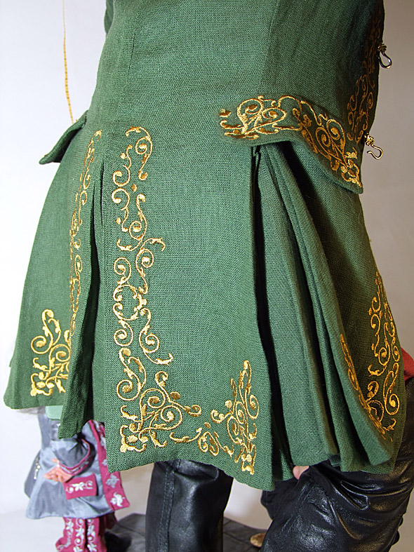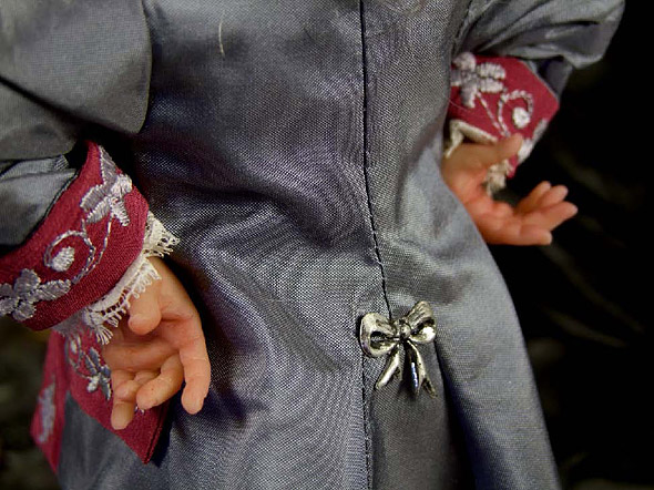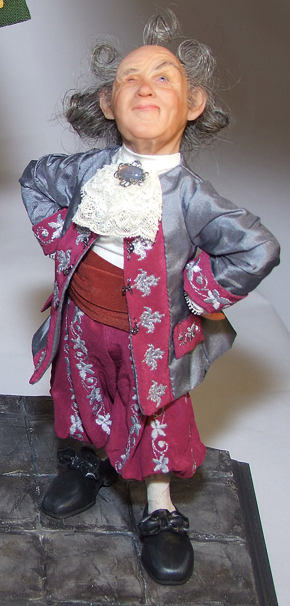 КостюмКостюм для куклы я шью точно так же как шила бы его для настоящего человека. Важно помнить, что лучше красить именно ткань, а не готовое изделие. Дело в том, что нитки для шитья синтетические и практически не окрашиваются. Не возможно заранее угадать, попадут они в тон окрашенной ткани или нет. Сняв все необходимые размеры, я использую обычные выкройки, только уменьшенные до нужного размера. Ткани я предпочитаю натуральные, они замечательно красятся в домашних условиях в любой требуемый цвет специальными красителями для ткани. ![]() Для Гулливера я нашла выкройку камзола нужной эпохи в интернете. Простые выкройки, например штанов, я делаю сама. Фурнитуру для кукольных костюмов практически невозможно купить в галантерейных магазинах, а потому ее лучше делать самостоятельно. Так, например, пуговицы для жилета я сделала из пластика и декорировала их после запекания. Надо сказать, что творческий процесс невозможно подогнать под выверенную схему — так что экспериментируйте! Зайдя в магазин для художников, вы столько там обнаружите интересных материалов и инструментов! Ведь аксессуары, выполненные непосредственно для данной куклы, только повысят ее класс. Такую куклу хочется разглядывать снова и снова, при этом каждый раз находить у нее что-то новое, сразу не замеченное — в этом настоящее волшебство! ![]() Большим подспорьем для меня в создании костюма Гулливера стала вышивальная машина. Удовольствие, конечно, не из дешевых, да и времени на освоение вышивальной программы требуется много. Но, на мой взгляд, оно того стоит! ![]() Камзол Гулливера с вышивкой. ![]() Одежда лилипутов также украшена вышивкой. ![]()